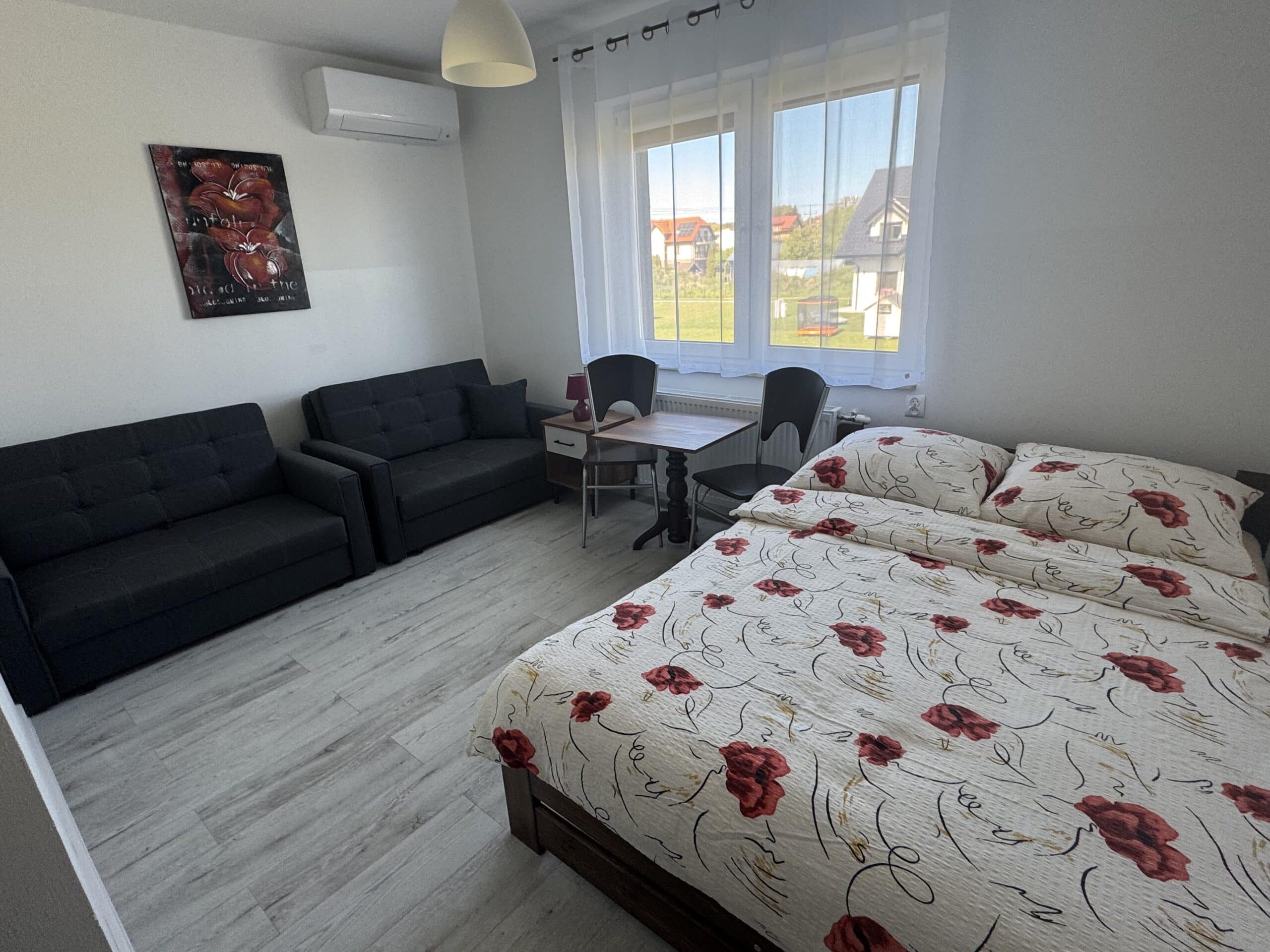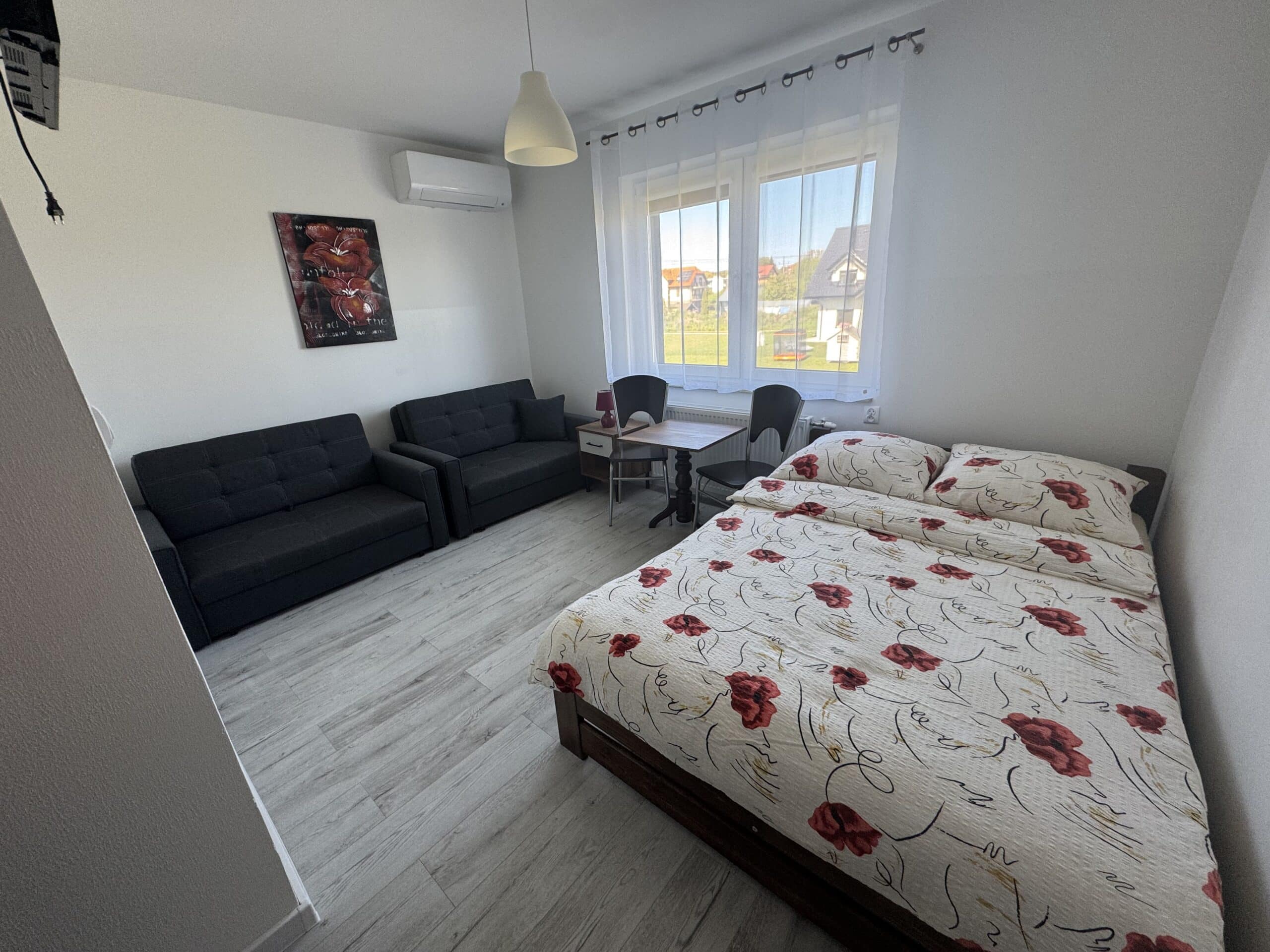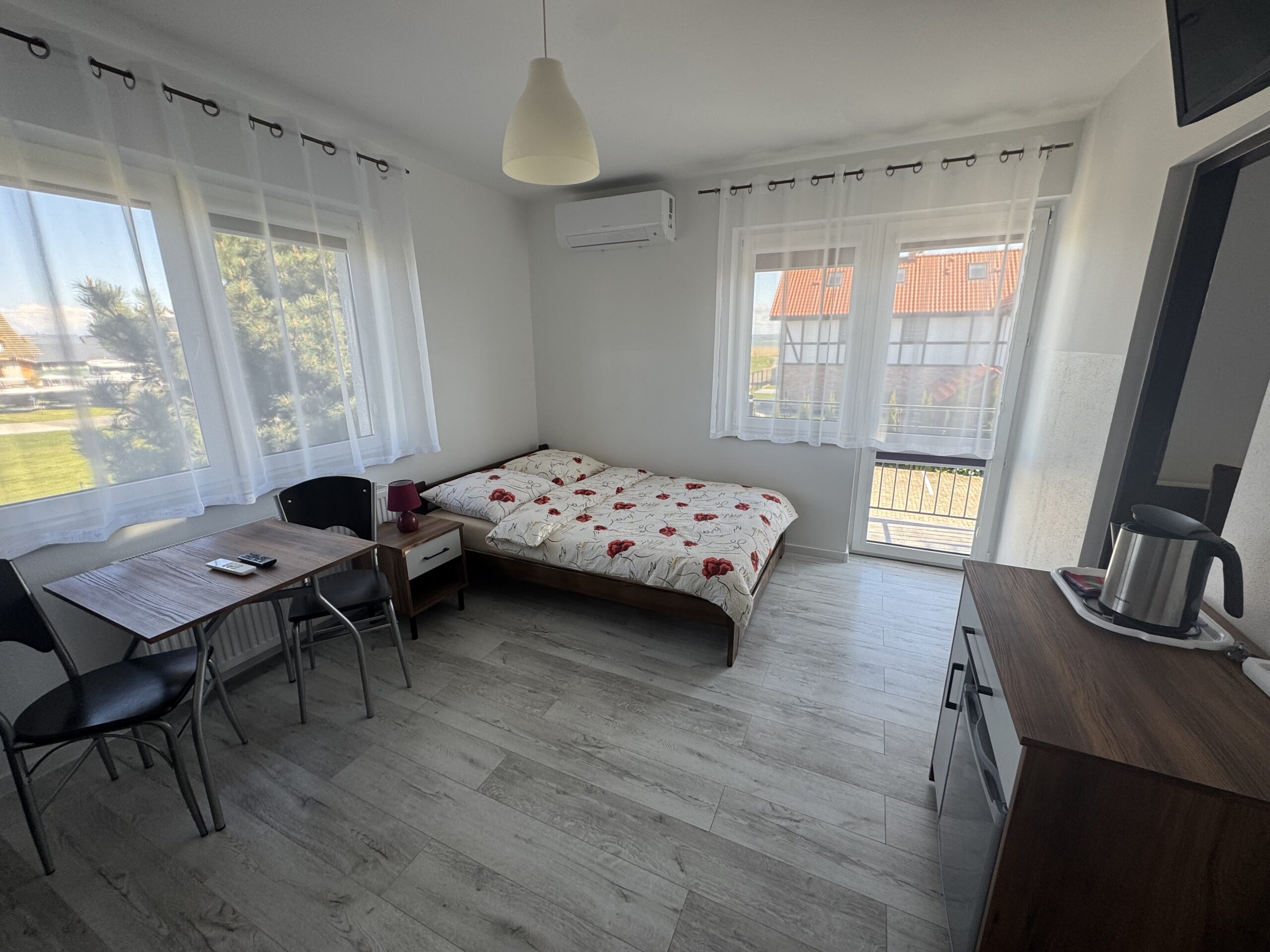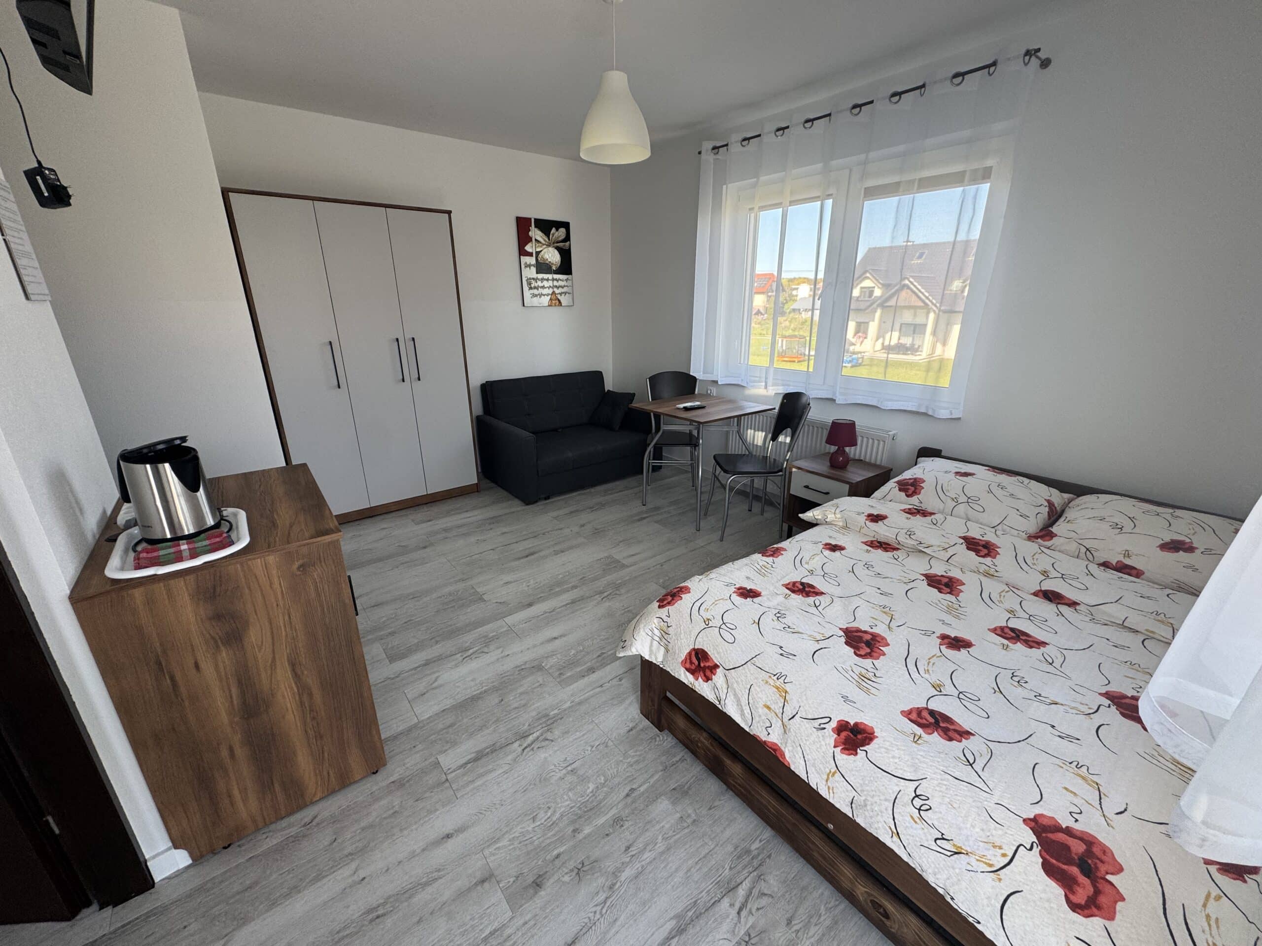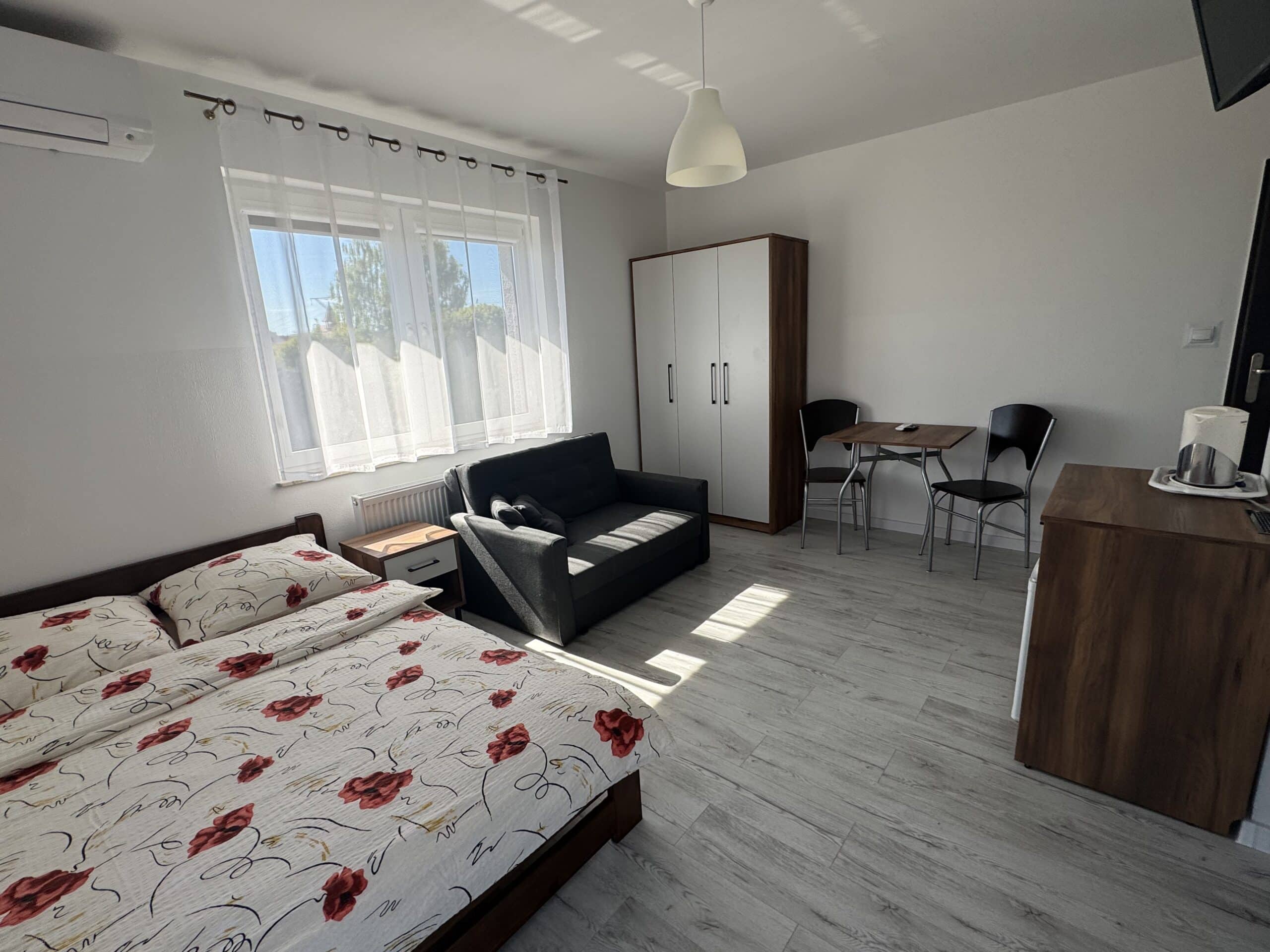 Pokoje typu studio, o powierzchni około 15 m², z balkonem lub bez, są klimatyzowane. Pokój składa się z dwóch pomieszczeń oraz łazienki. Delikatna kolorystyka oraz klasyczny wystrój tworzą przytulną aranżację wnętrza. W pokoju znajduje się łazienka z prysznicem. Do dyspozycji gości jest telewizor, szafa, mała lodówka oraz stolik z krzesłami. Goście mogą również korzystać z sauny, kuchni i jadalni na dole budynku. Posiłki są we własnym zakresie. Cena noclegu nie obejmuje posiłków. Do dyspozycji gości pozostają również wszelkie dostępne letnie akcesoria na zewnątrz: grill, pergola, leżaki.