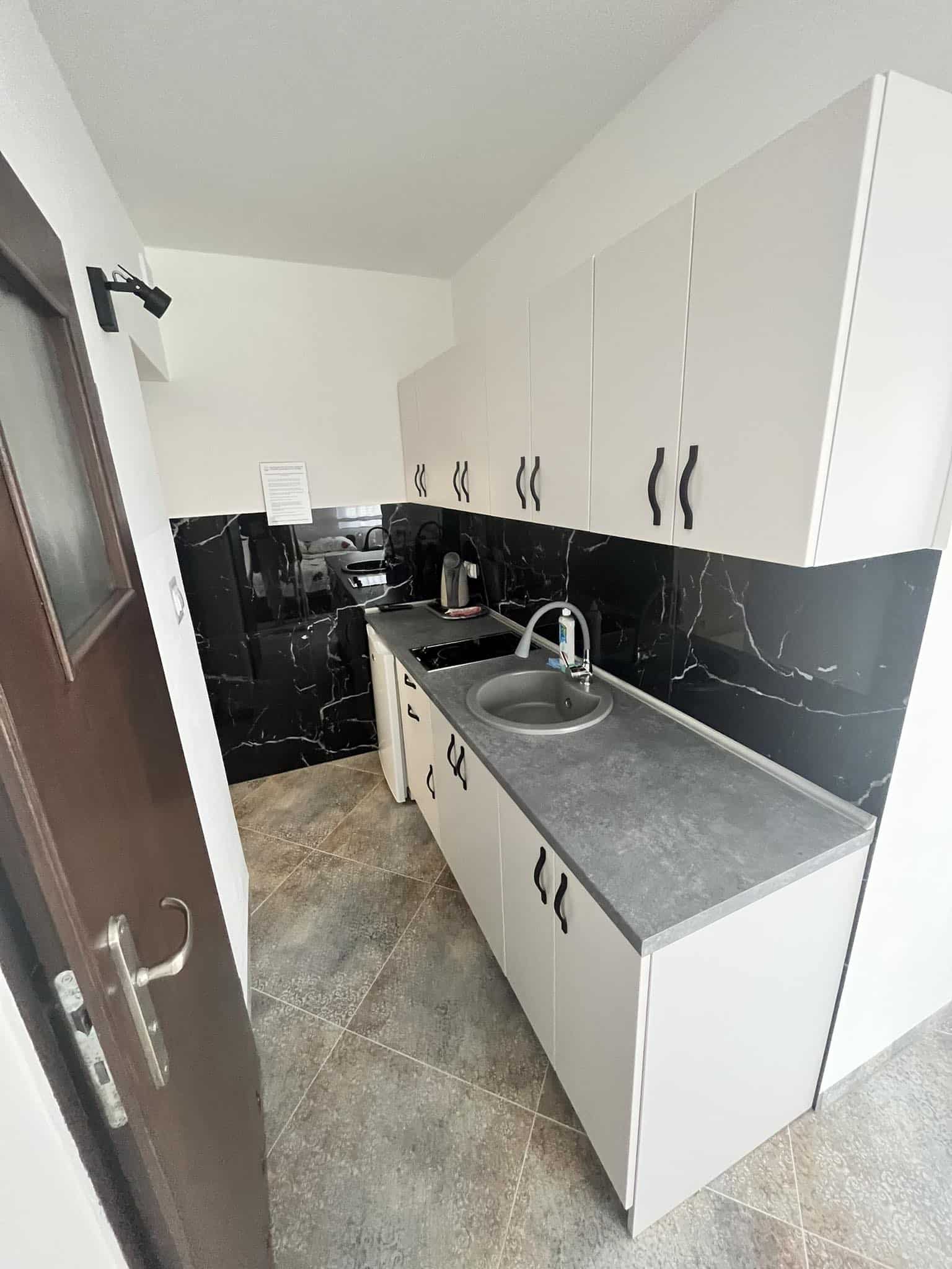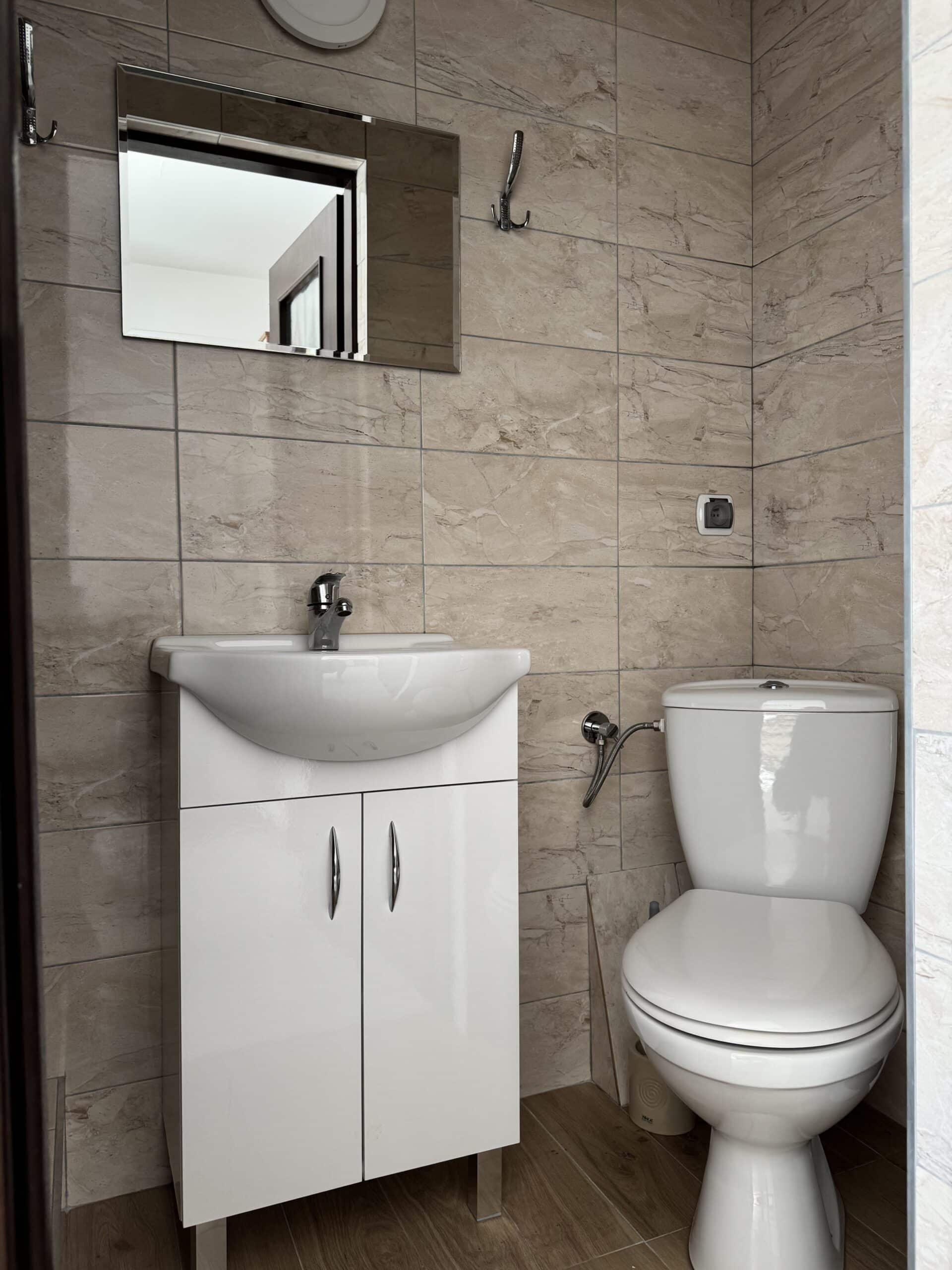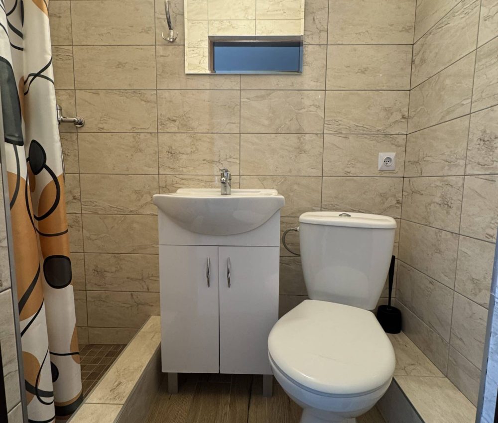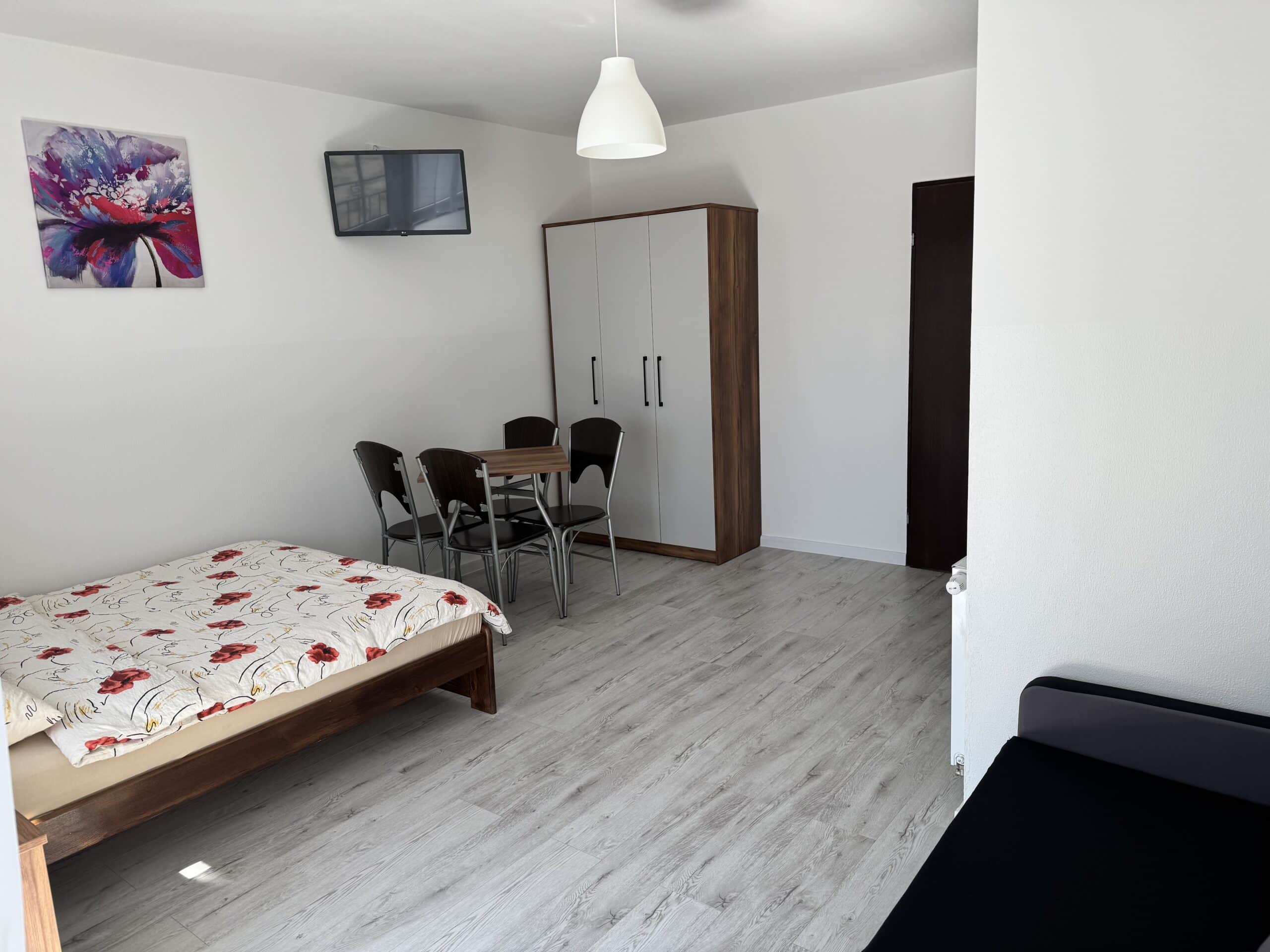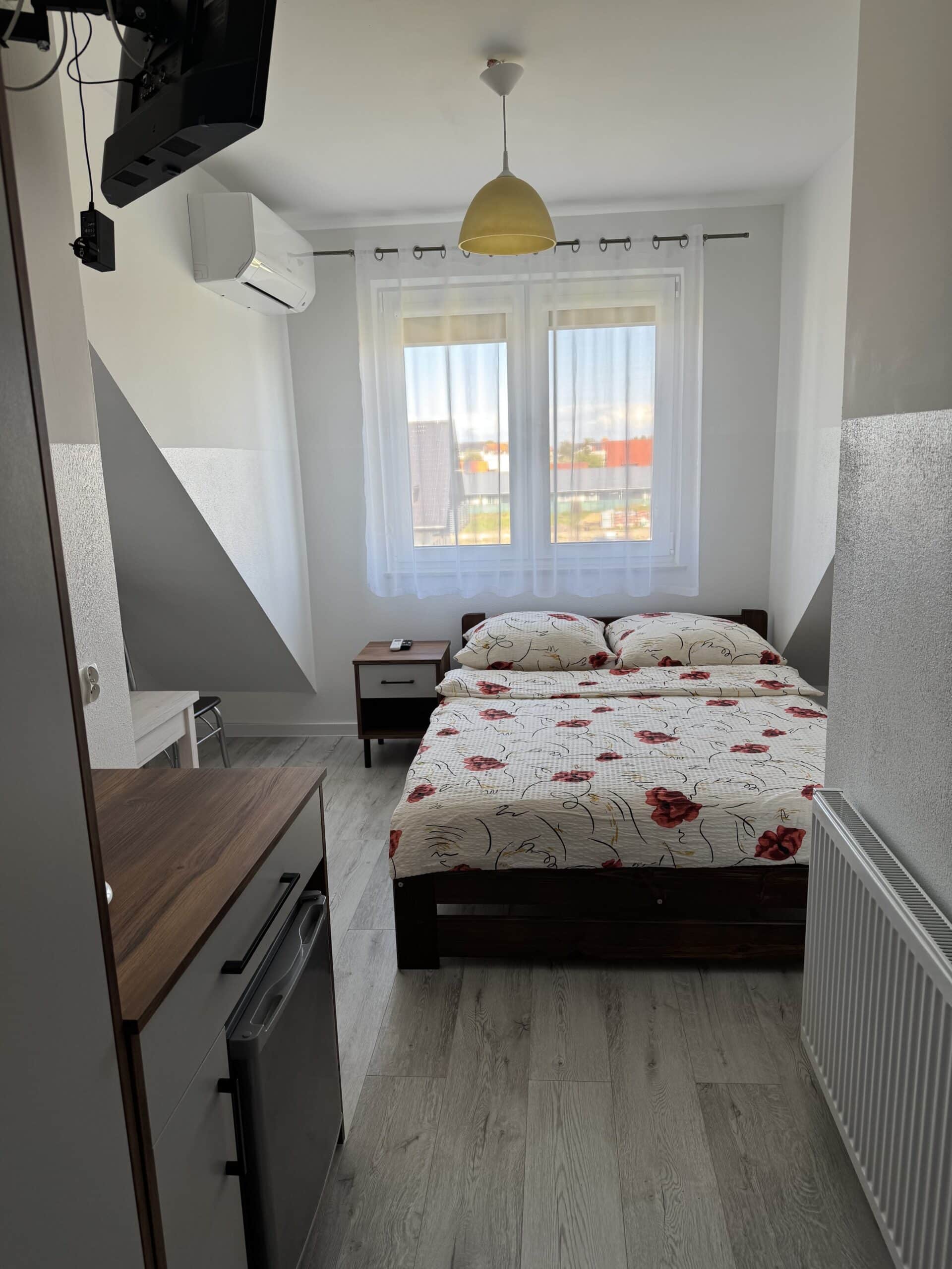 Pokoje typu studio, o powierzchni około 15 m², z balkonem lub bez, są klimatyzowane. Pokój składa się z dwóch pomieszczeń oraz łazienki. Delikatna kolorystyka oraz klasyczny wystrój tworzą przytulną aranżację wnętrza. W pokoju znajduje się łazienka z prysznicem. Do dyspozycji gości jest telewizor, szafa, mała lodówka oraz stolik z krzesłami. Goście mogą również korzystać z sauny, kuchni i jadalni na dole budynku. Posiłki są we własnym zakresie. Cena noclegu nie obejmuje posiłków. Do dyspozycji gości pozostają również wszelkie dostępne letnie akcesoria na zewnątrz: grill, pergola, leżaki.