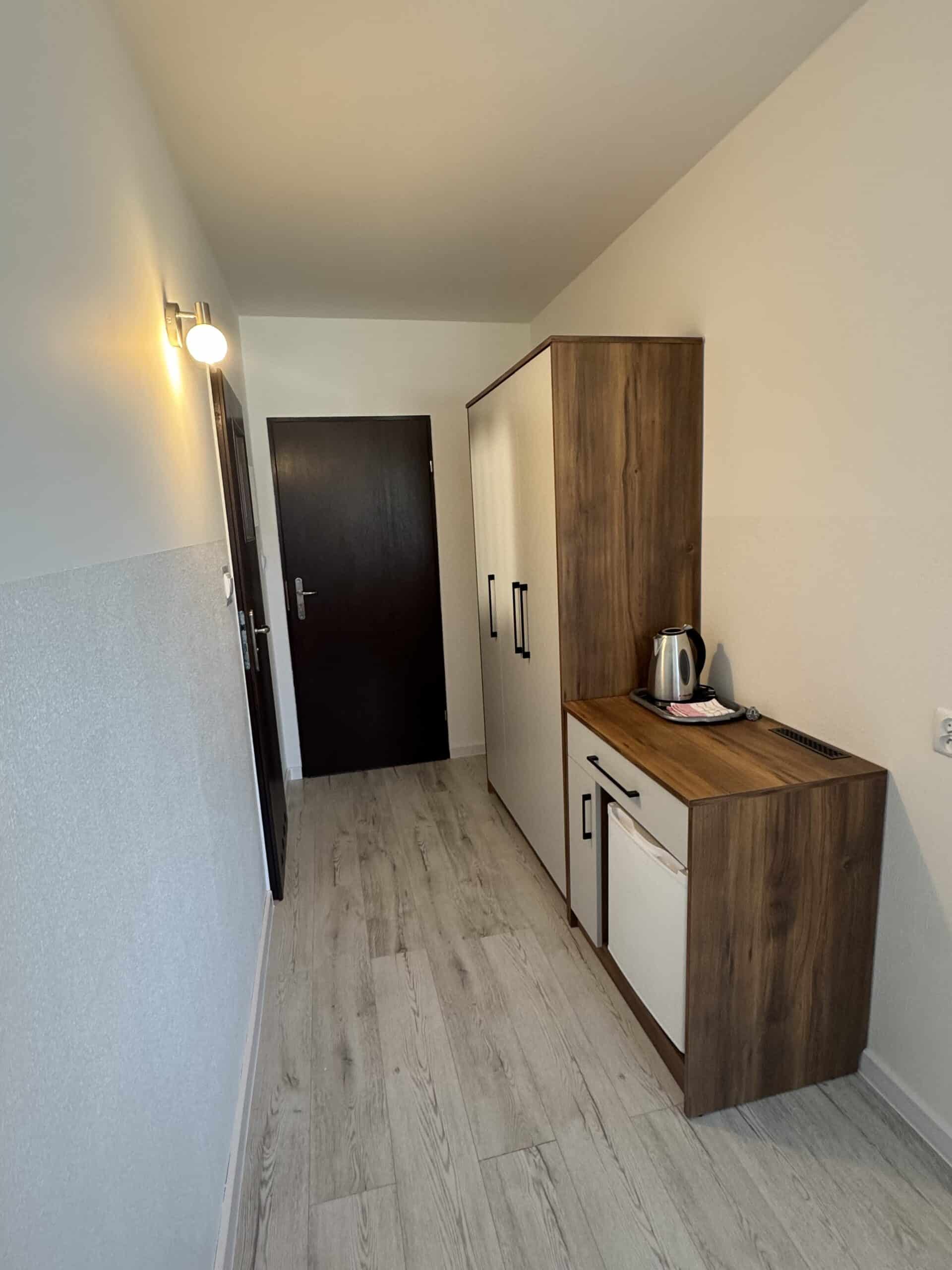 Pokoje 1- lub 2-osobowe, o powierzchni około 12 m², z balkonem lub bez, są klimatyzowane. Jasna kolorystyka oraz klasyczny wystrój tworzą przytulną aranżację wnętrza. W pokoju znajduje się łazienka z prysznicem. Do dyspozycji gości jest telewizor, szafa, mała lodówka oraz stolik z krzesłami. Goście mogą również korzystać z sauny, kuchni i jadalni na dole budynku. Posiłki są we własnym zakresie. Cena noclegu nie obejmuje posiłków. Do dyspozycji gości pozostają również wszelkie dostępne letnie akcesoria na zewnątrz: grill, pergola, leżaki.