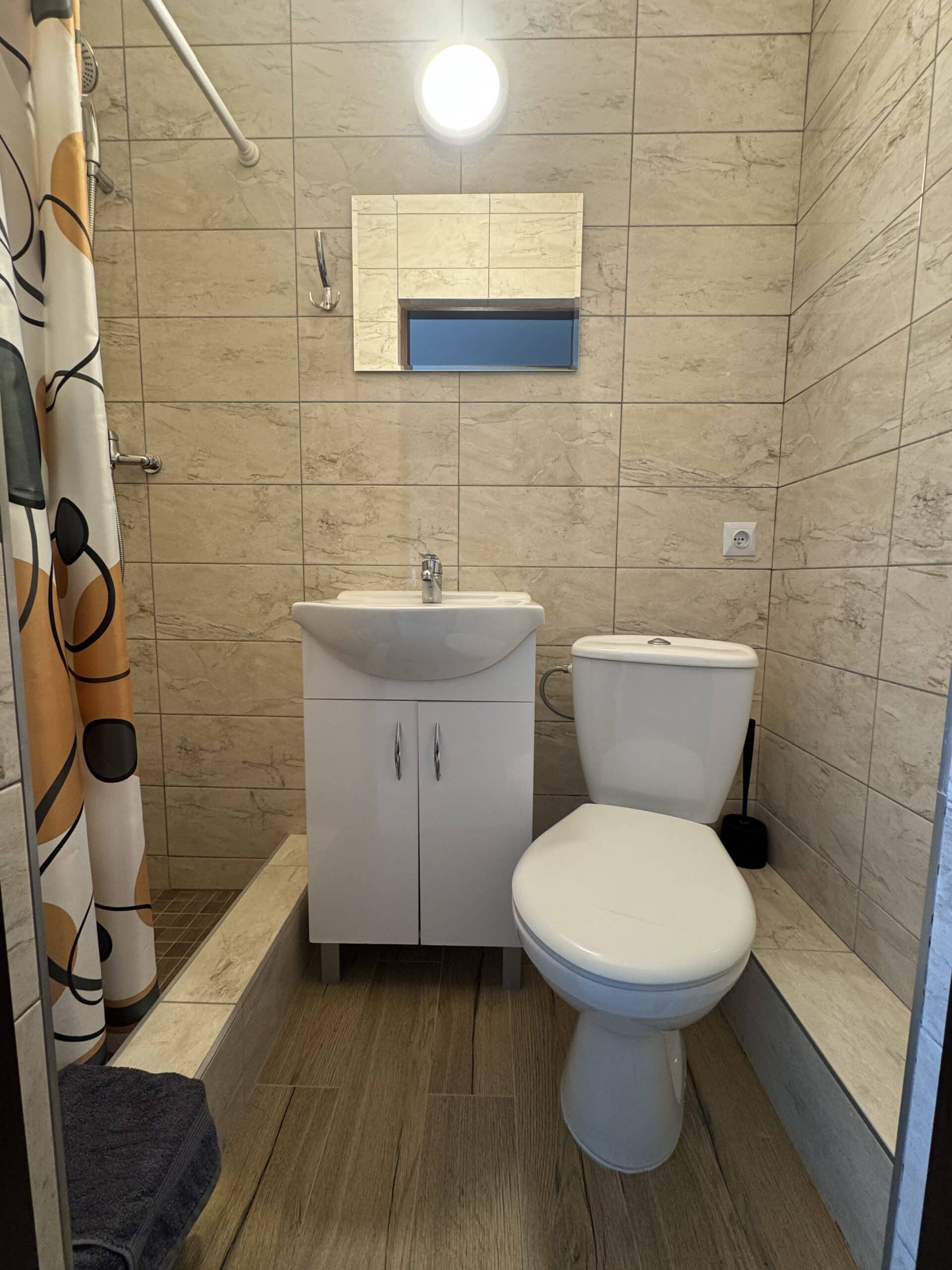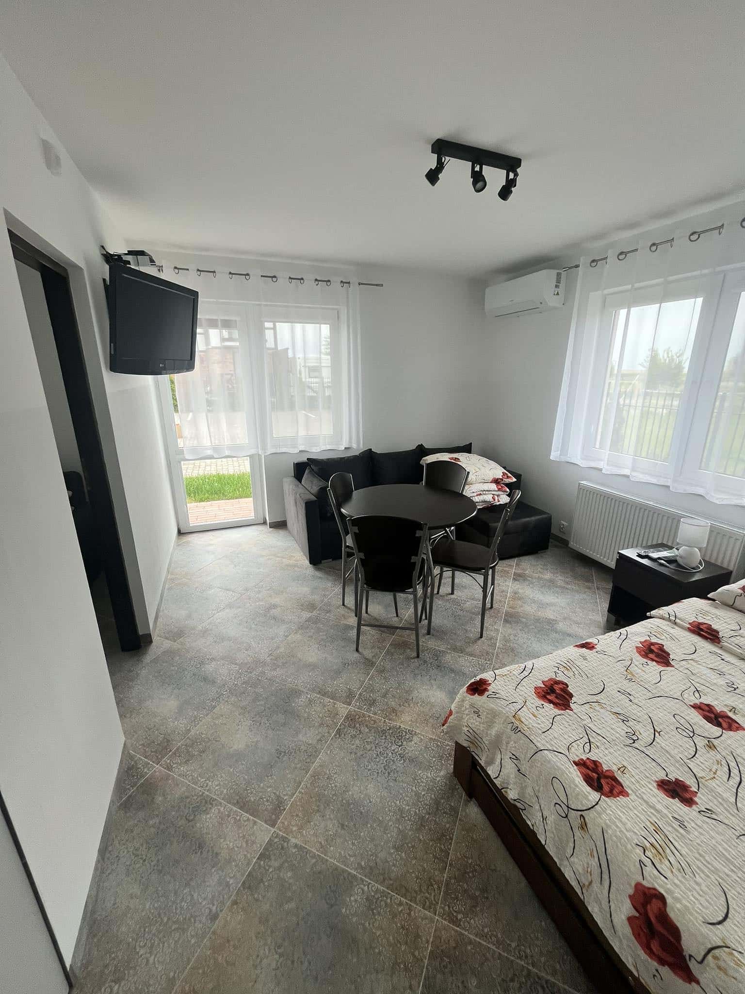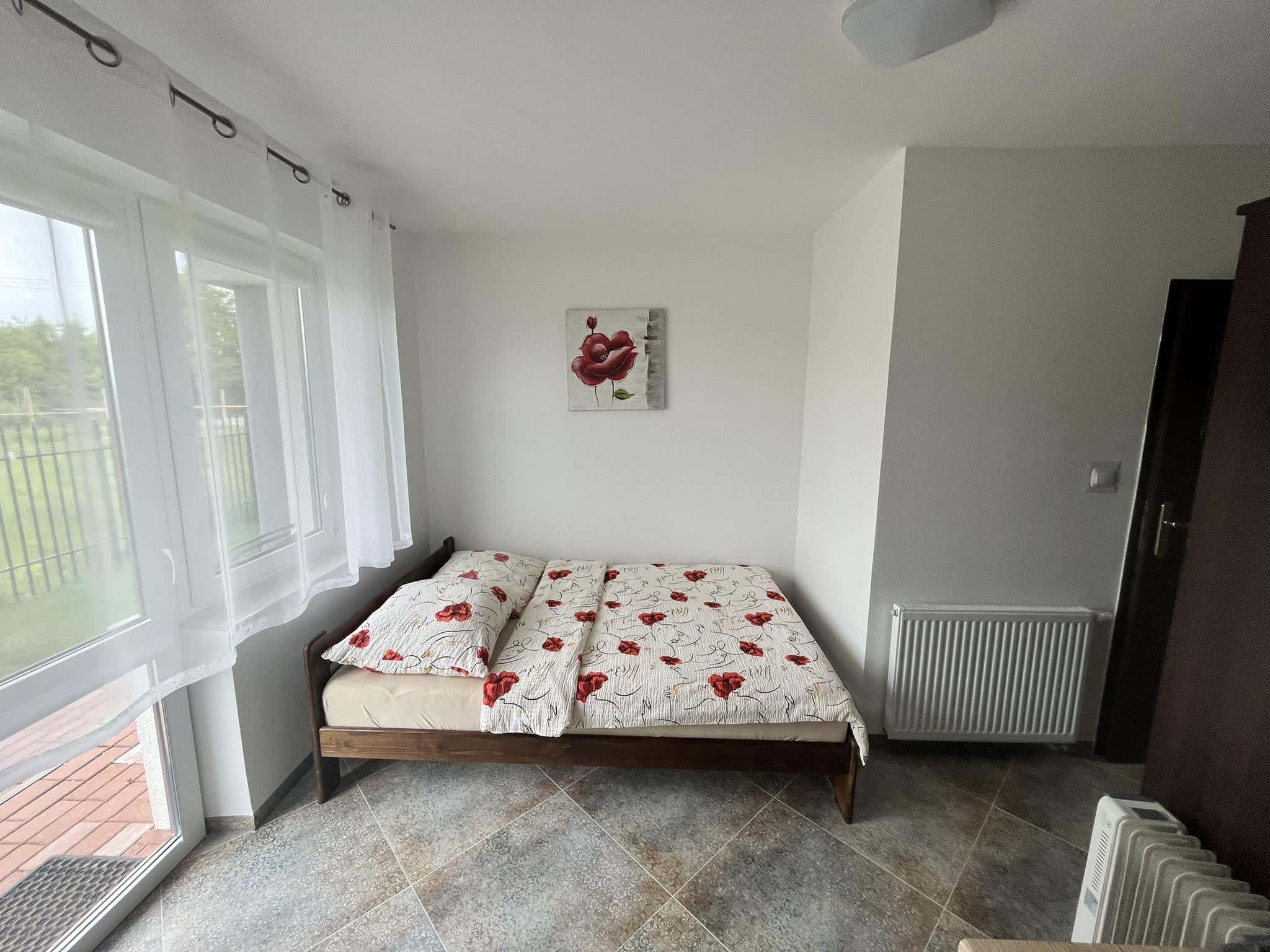 Apartament o powierzchni 17 m², z balkonem, klimatyzowany, zlokalizowany jest na parterze budynku. Składa się z prywatnej kuchni oraz łazienki. W głównym pomieszczeniu znajduje się stół z krzesłami i dwuosobowe łóżko małżeńskie. Do apartamentu przynależy także oddzielne pomieszczenie z łóżkiem. Do dyspozycji gości w apartamencie jest telewizor, szafa oraz mała lodówka. Goście mogą również korzystać z sauny oraz jadalni (użytkowanej we własnym zakresie). Cena noclegu nie obejmuje posiłków. Do dyspozycji gości pozostają również wszelkie dostępne letnie akcesoria na zewnątrz: grill, pergola, leżaki.