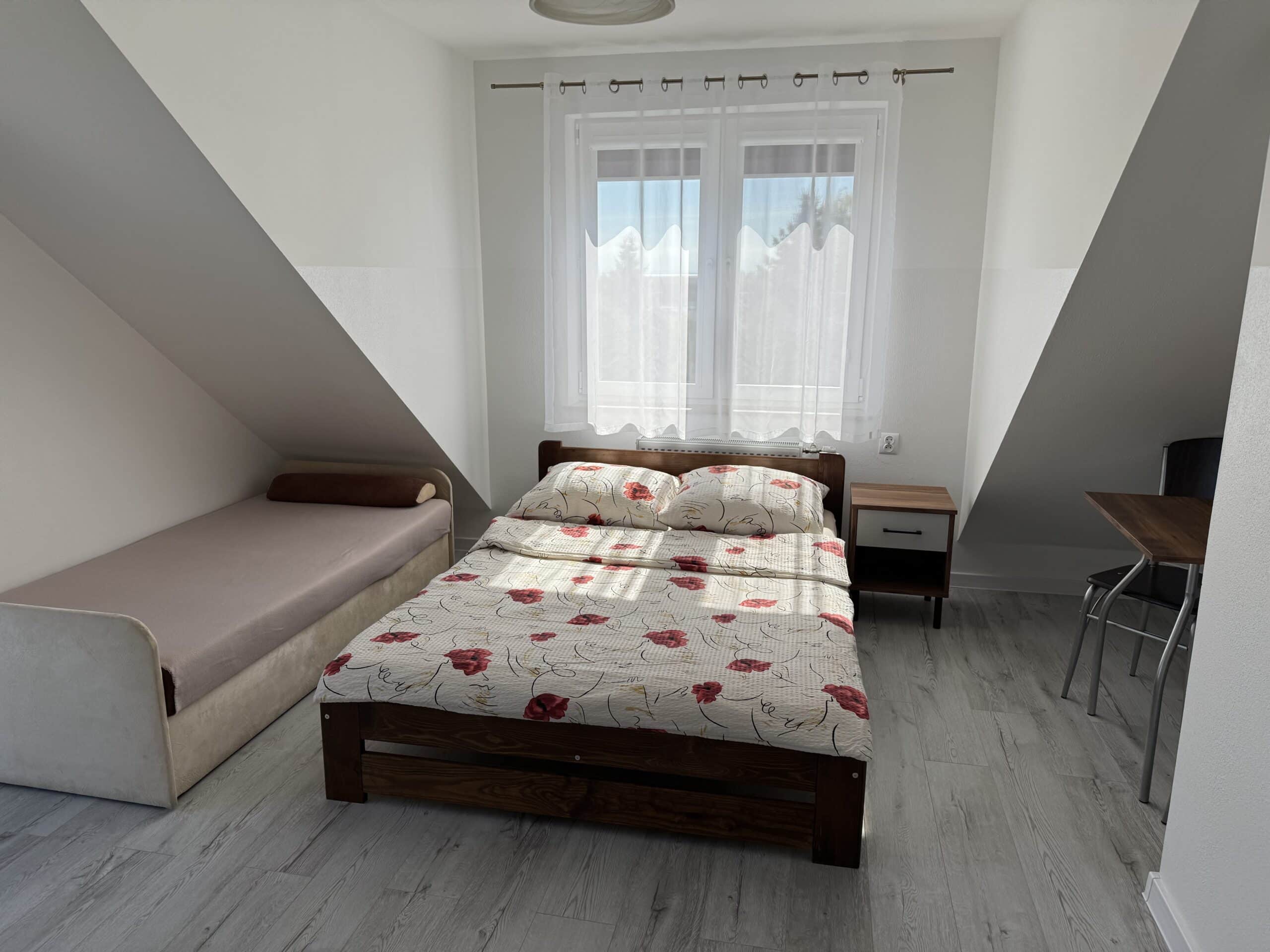Goście mogą liczyć na świeżo pościelone łóżka oraz ciche i wygodne miejsca do wypoczynku. Willa przeszła generalny remont w 2023 roku i jest idealnym miejscem dla komfortowego wypoczynku. Delikatna kolorystyka ścian i meble w kolorach brązu tworzą aranżację idealną do wakacyjnego noclegu. Przy dłuższym pobycie, na życzenie gości, wykonujemy dodatkowe sprzątanie pokoju: wymiana pościeli, odkurzanie.