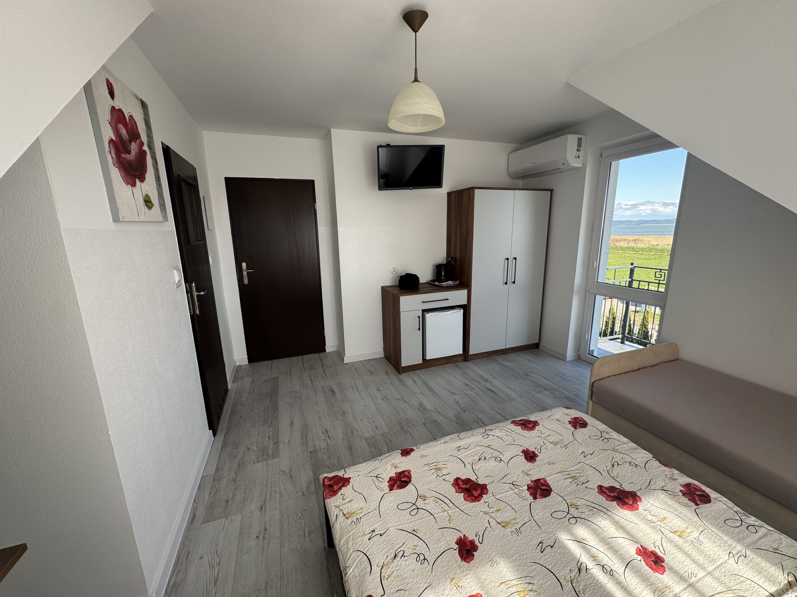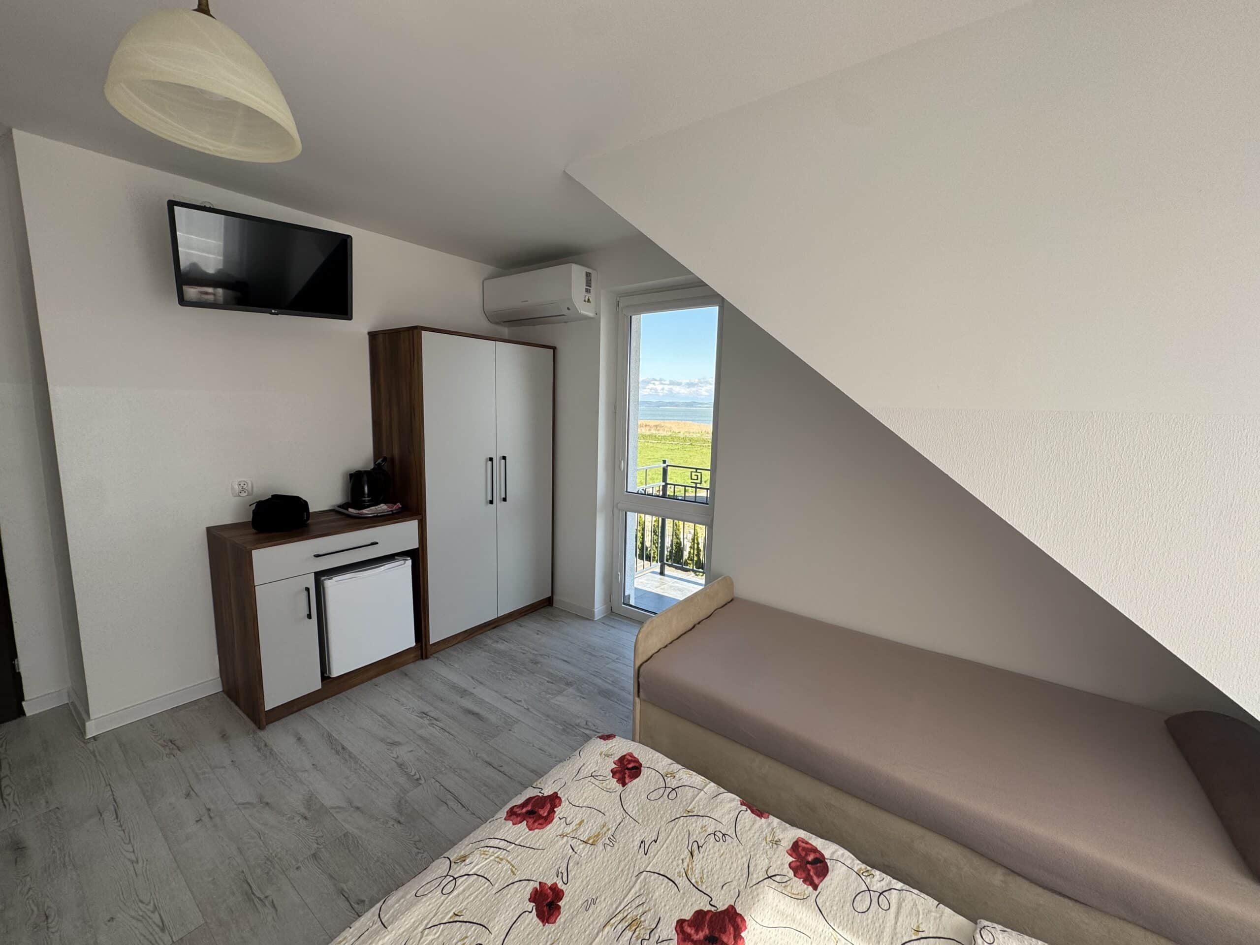 Pokoje 3-osobowe, o powierzchni 17 m², z balkonem lub bez, są klimatyzowane. Delikatna kolorystyka oraz klasyczny wystrój tworzą przytulną aranżację wnętrza. W pokoju znajduje się łazienka z prysznicem. Do dyspozycji gości jest telewizor, szafa, mała lodówka oraz stolik z krzesłami. Goście mogą również korzystać z sauny, kuchni na parterze budynku oraz jadalni. Posiłki są we własnym zakresie. Cena noclegu nie obejmuje posiłków. Do dyspozycji gości pozostają również wszelkie dostępne letnie akcesoria na zewnątrz: grill, pergola, leżaki.